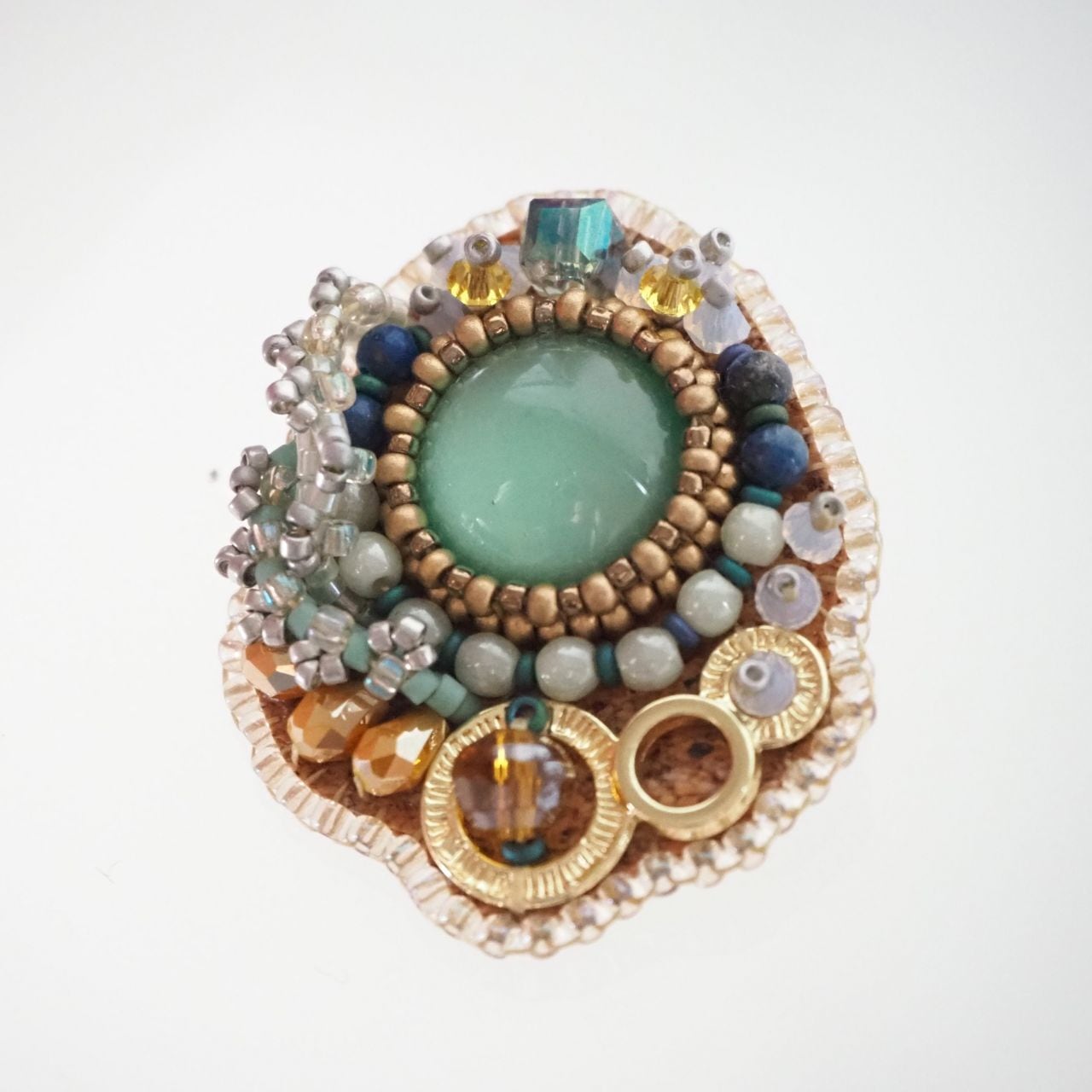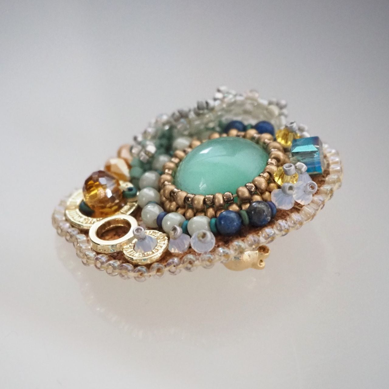 爽やかなグリーンのカボションと、色々な種類のガラスビーズを使ったユニークなブローチです。