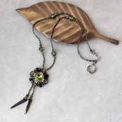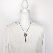 こだわりは、ネックロープに使用している「真空蒸着ビーズ」。丸小ですが、半分だけ色の濃さが異なるアンティーク感あふれるビーズです。