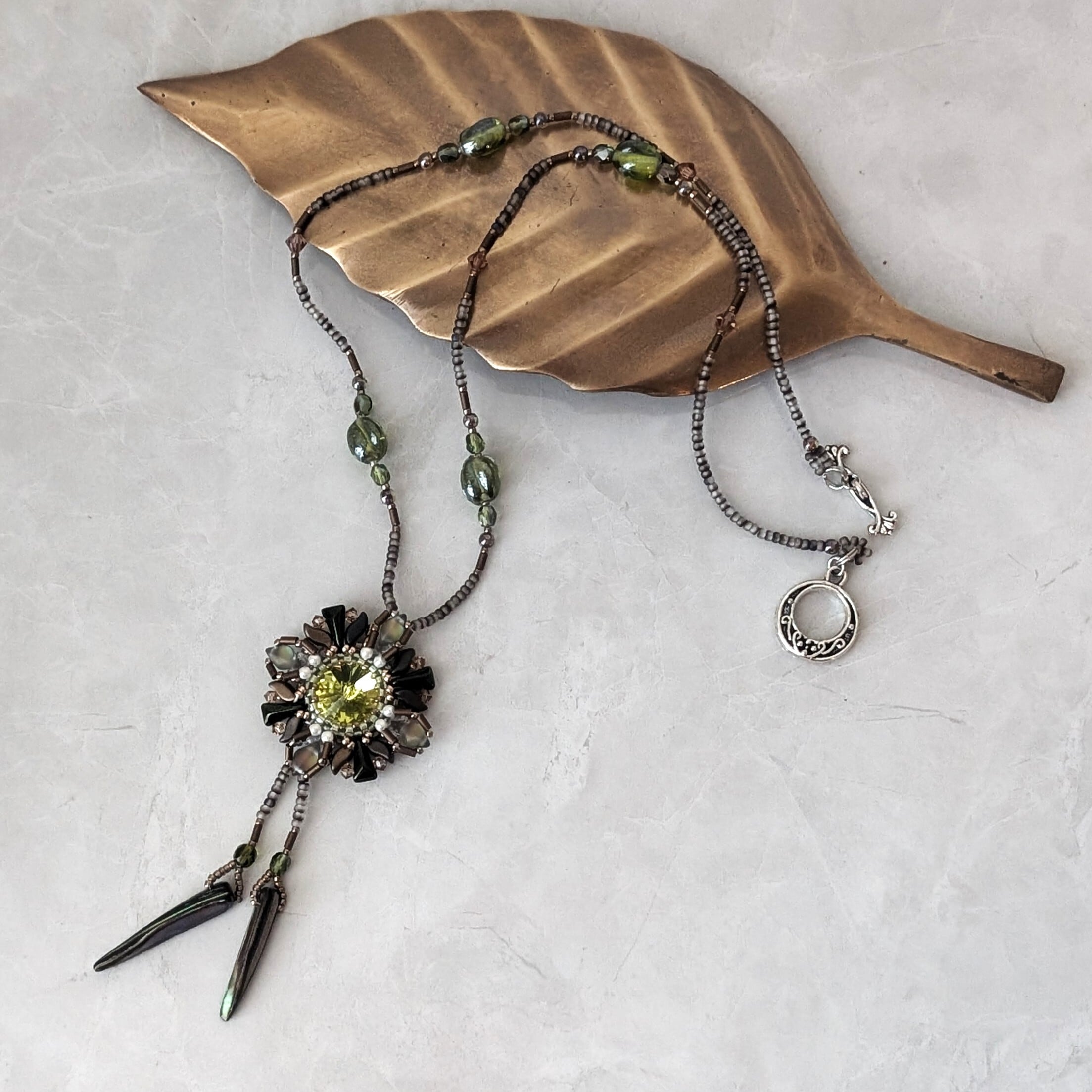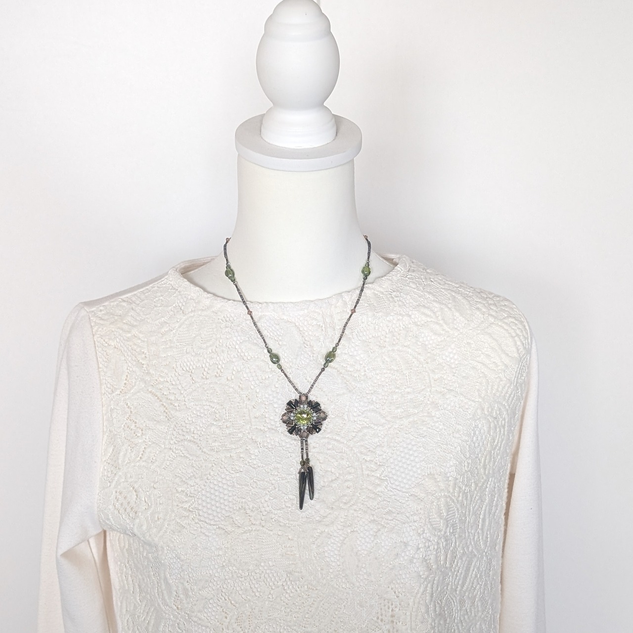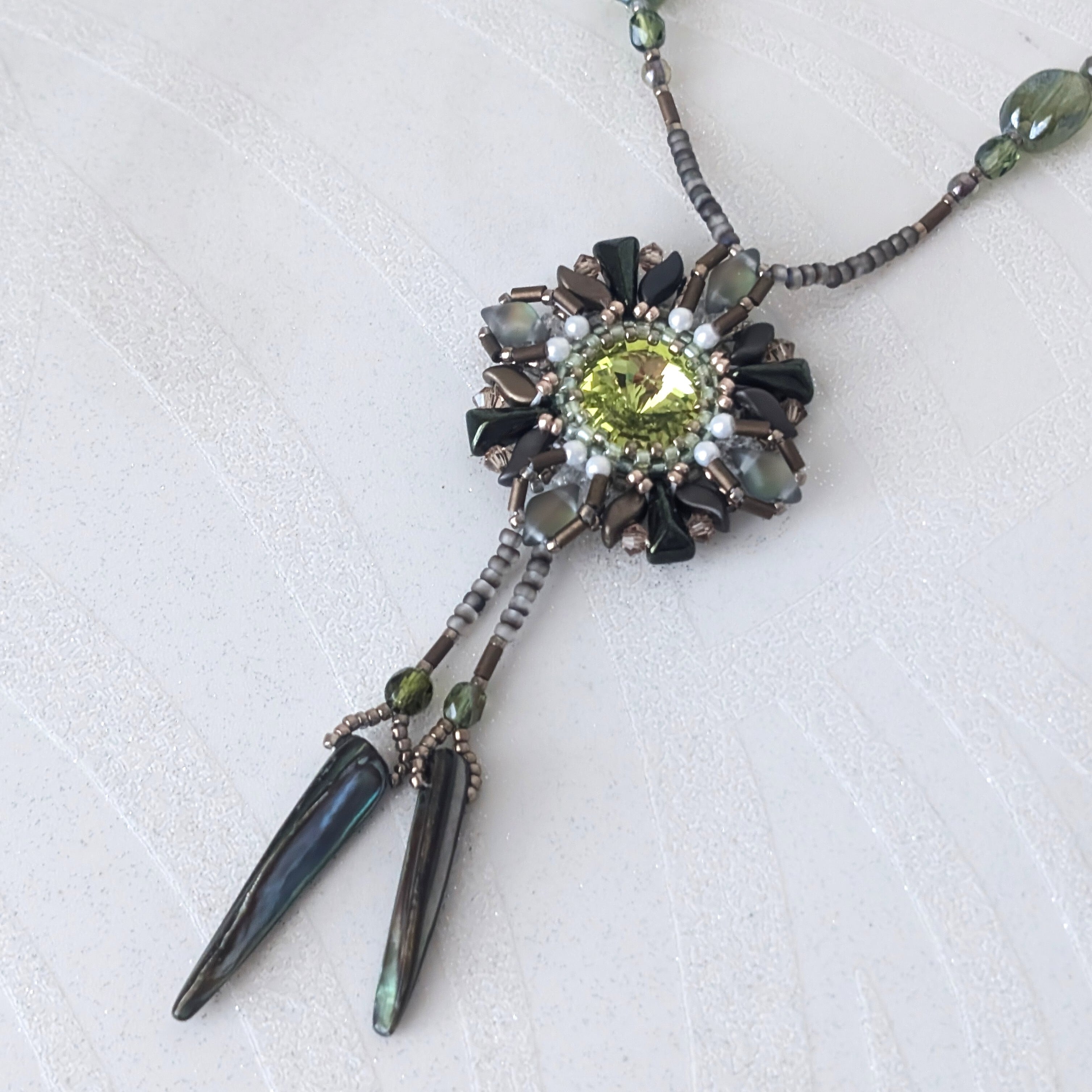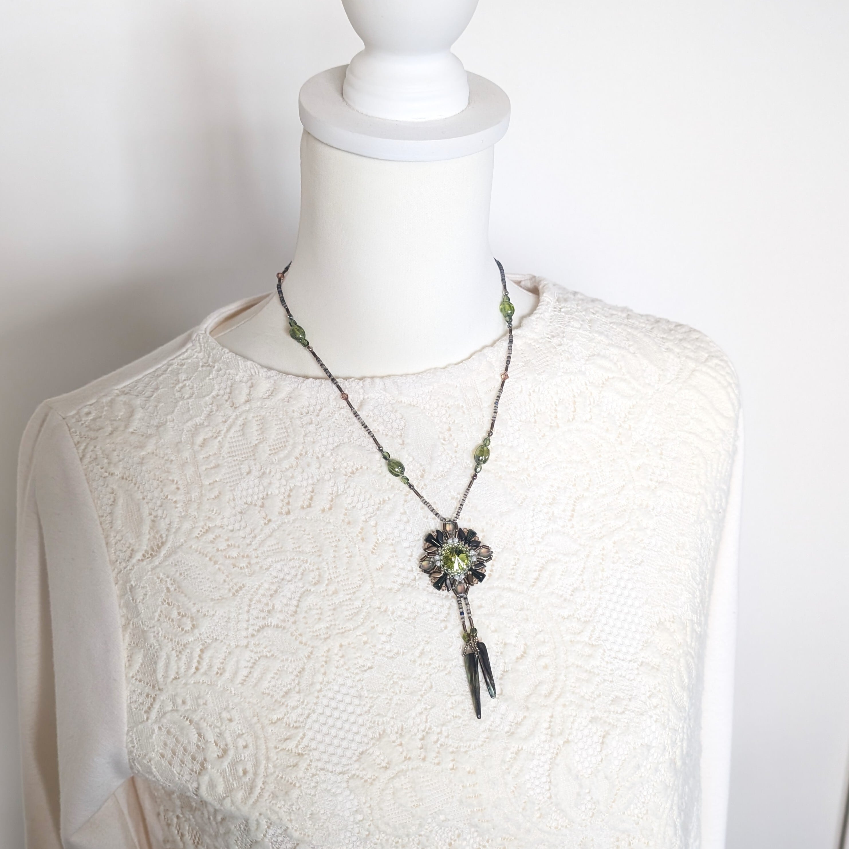2ホールのビーズ(ジェムデュオ、ストームデュオ、ヴェクソロ)で個性的なスタイルに演出。胸元に優雅に光ります。