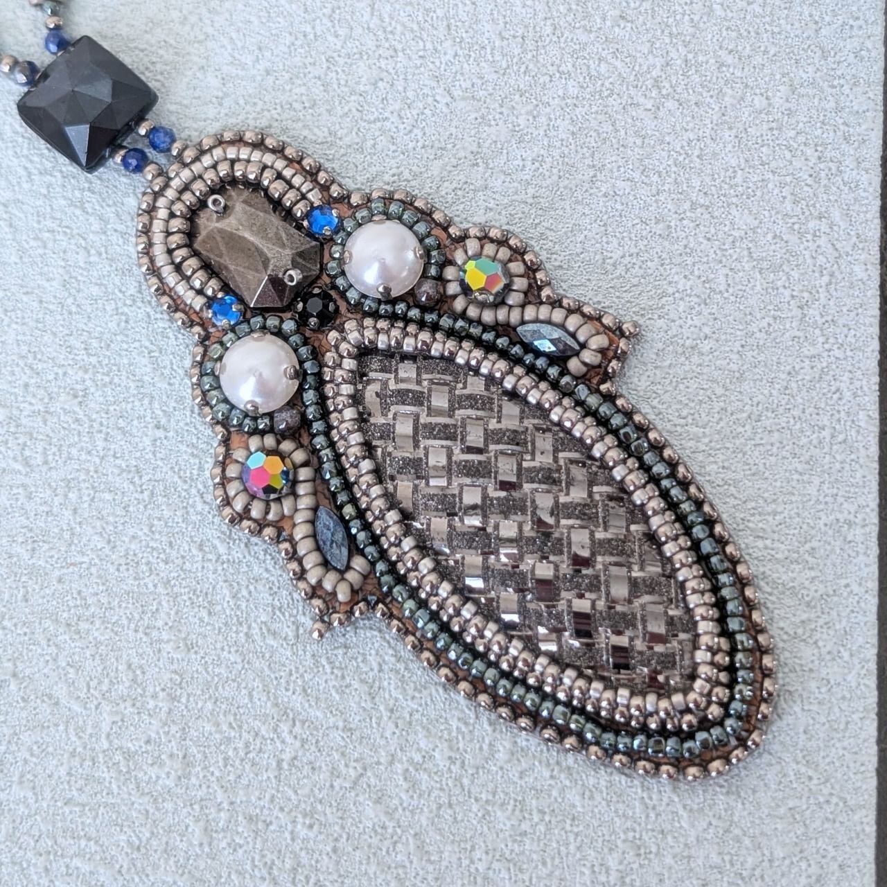 トップはコルクシートに刺繍をして、ネックロープはビーズステッチでモチーフの連続あ編みで仕上げます。