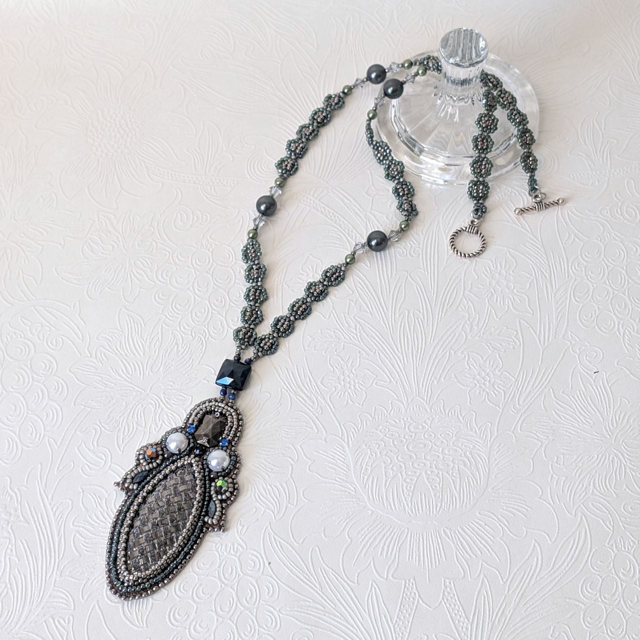 大人なモノトーンにグリーンが映える、都会的なネックレスです。