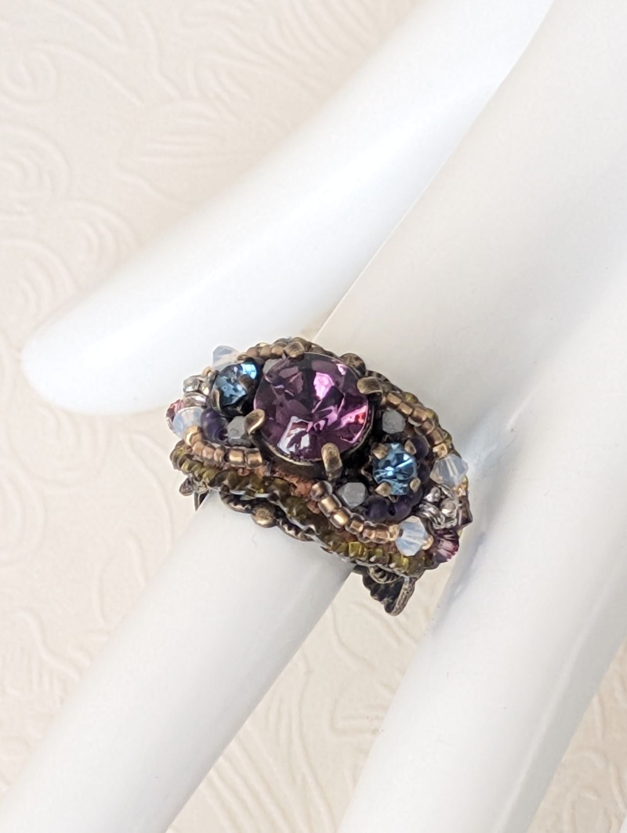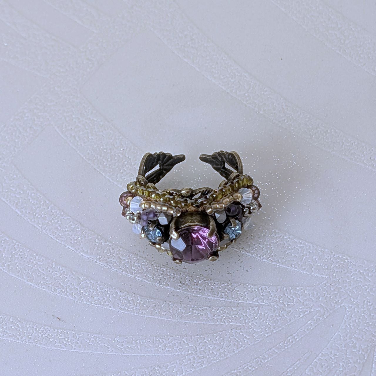ビーズ刺繍で仕上げてから、リング台に縫い留めます。(硬めなので、ペンチで針を抜き差ししてくださいね)