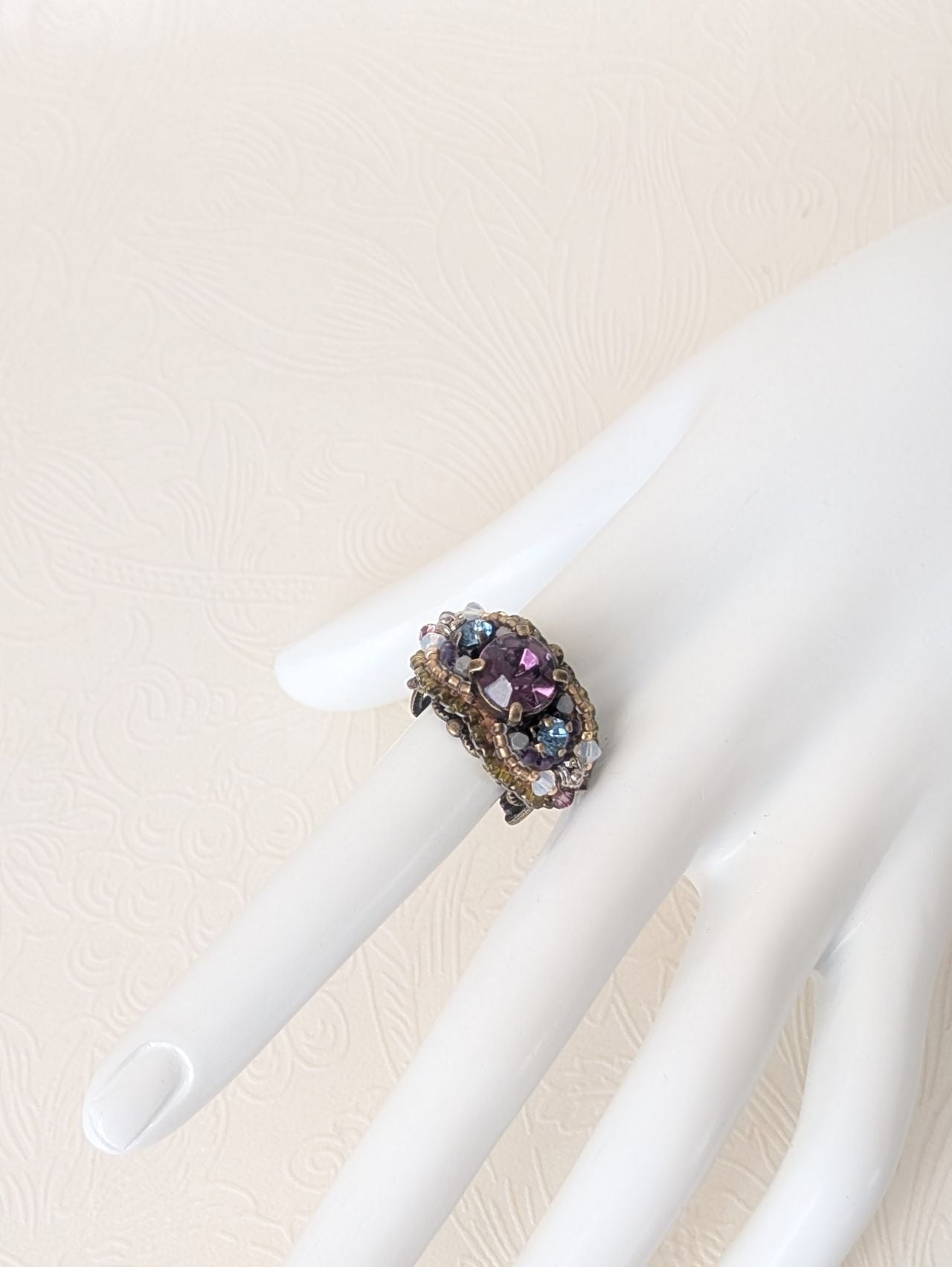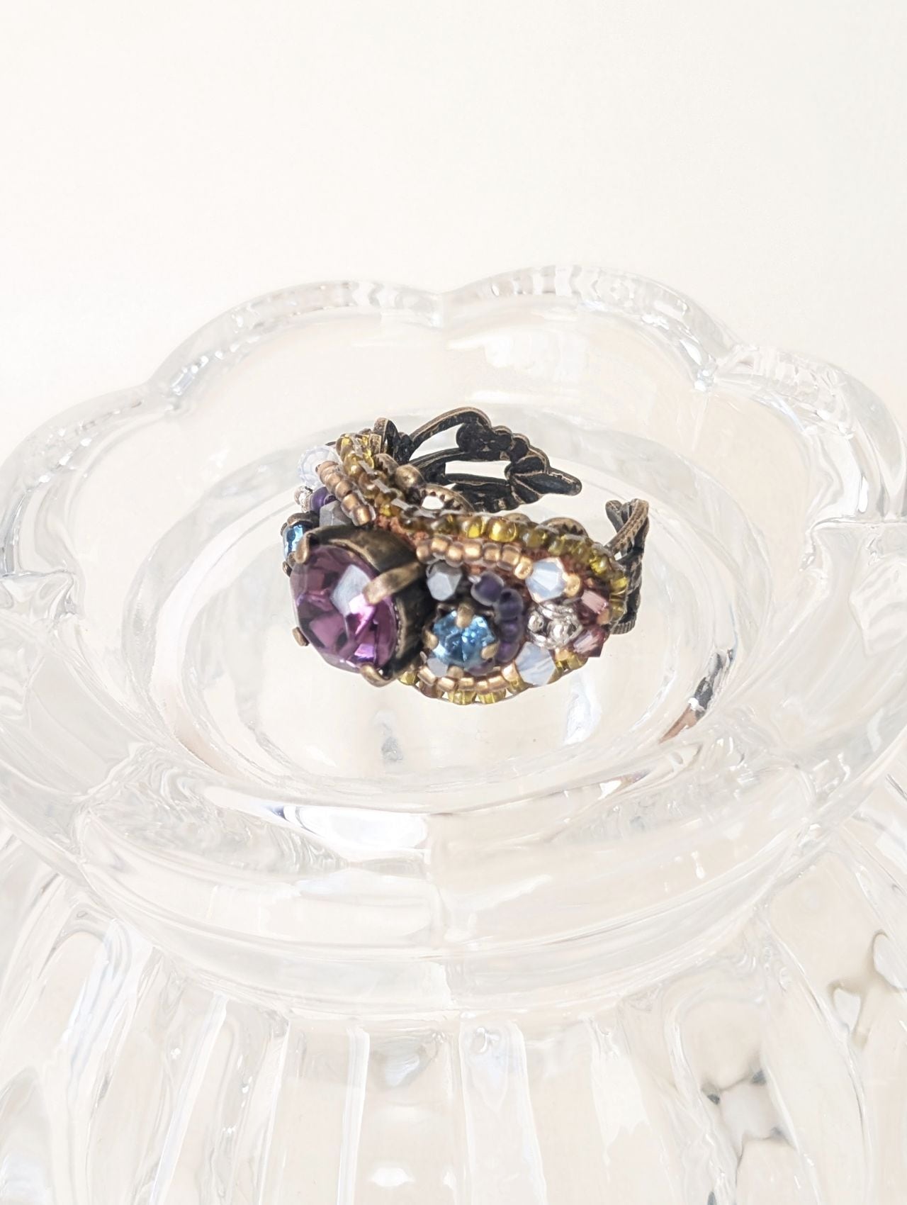 ヴィンテージのガラスに、艶消しのヘマタイト、ラインストーンなど、厳選した素材を生かして盛り込みました。