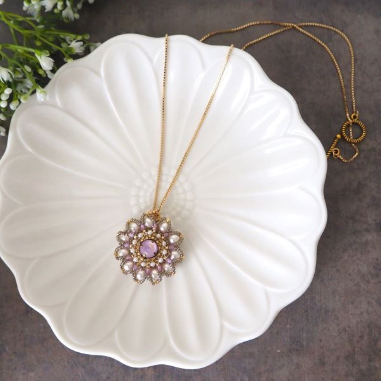 クリスタルガラスの輝きと、はじけるようなパールの艶感がマッチしたラウンドネックレスです。硬めにしっかり編むのが、美しく仕上がるコツです。