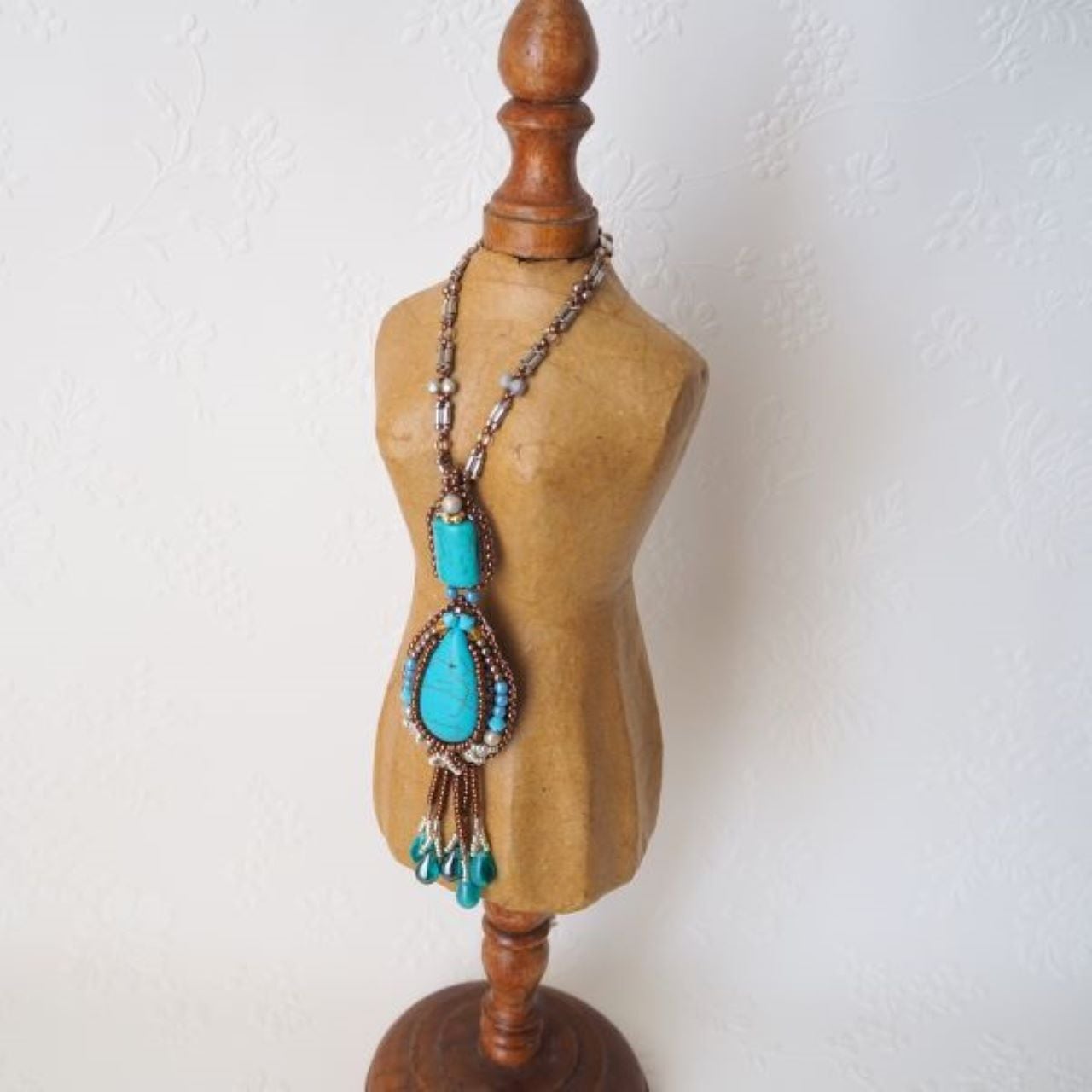 使用素材…ターコイズ(練り)、ガラスビーズ、竹ビーズ、金属留め具、コルクシート、メタルパーツ