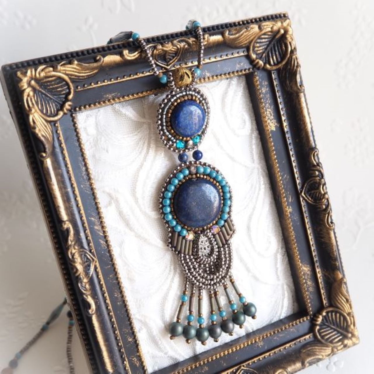 大小二つのラピスラズリを上下に配置した、縦長タイプのスタイリッシュなネックレスです。