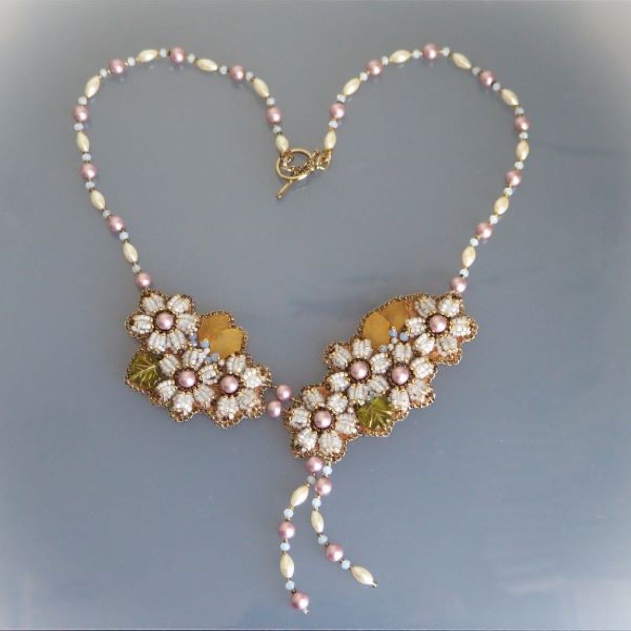 パウダーローズのガラスパールを中心に、ふっくらとした立体的な花弁の花モチーフを組み合わせた、ビーズ刺繍のネックレスです。