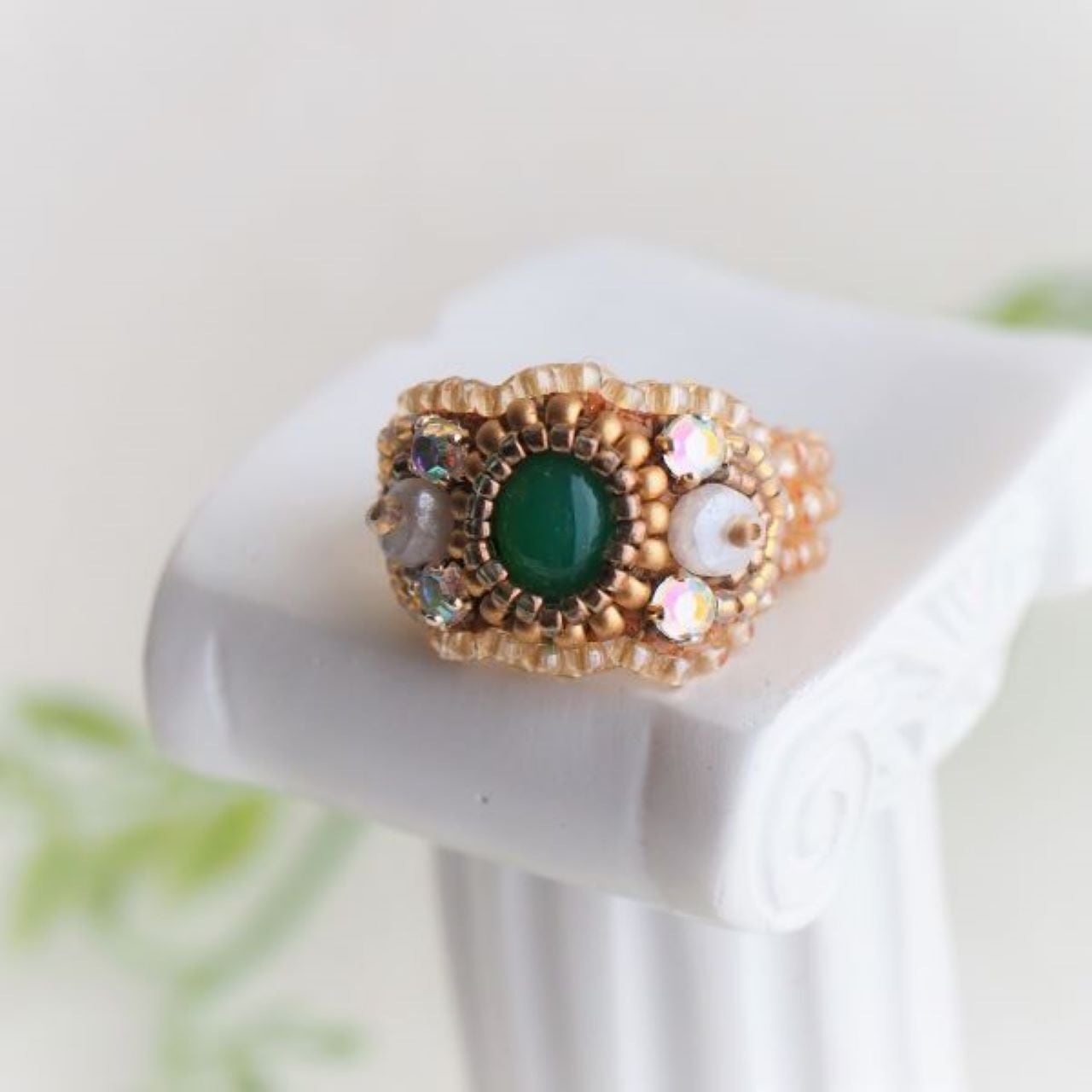 綺麗なメノウのカボションを中心に、シリマナイト、ラインストーンなどで飾った、刺繍のリングです。
