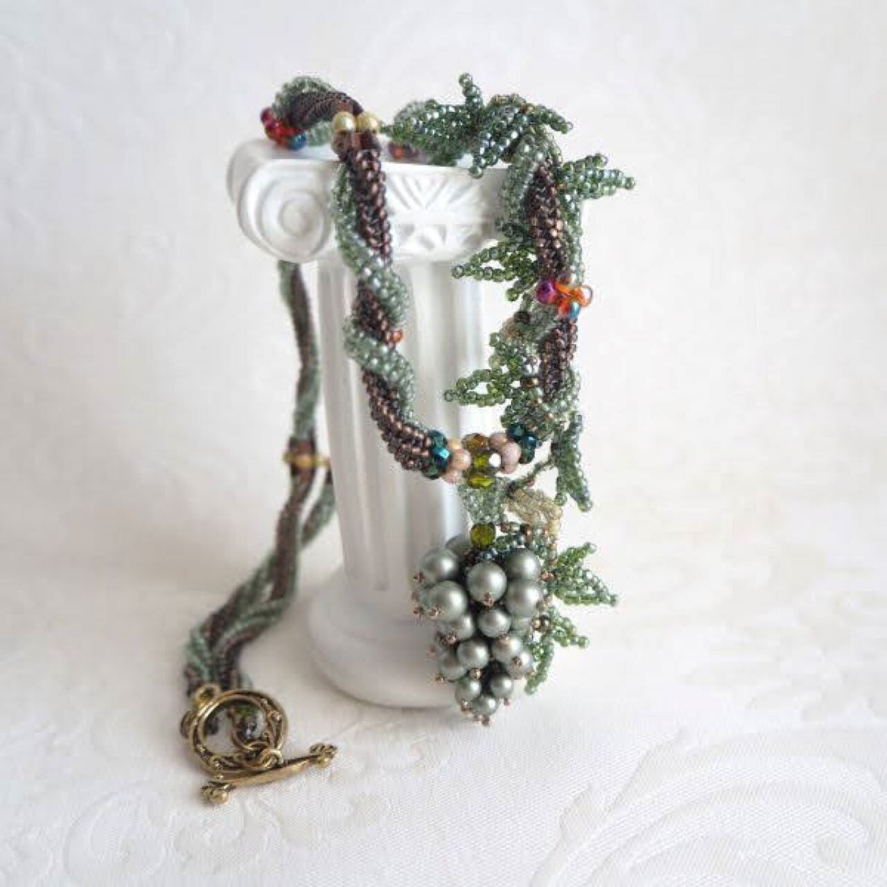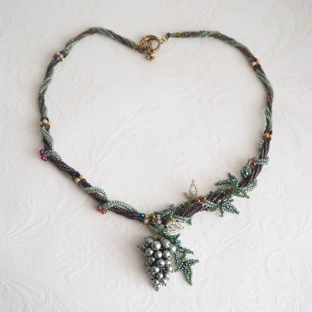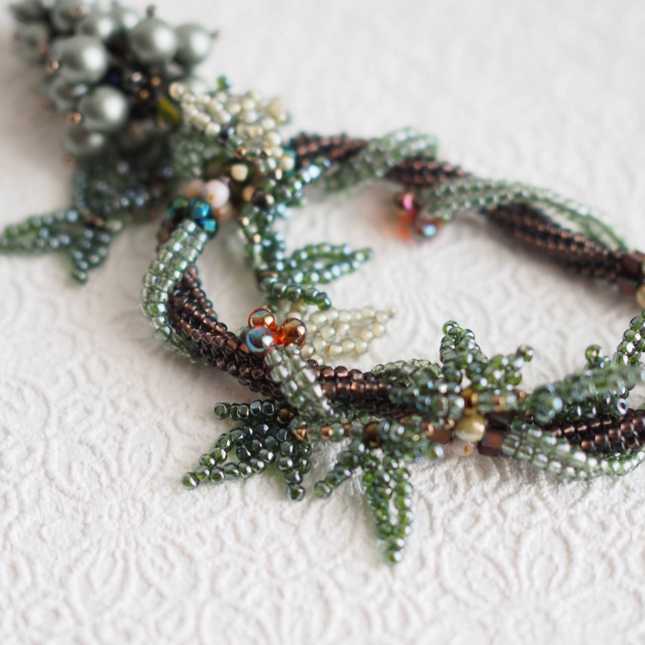 ぶどうのモチーフは、ペヨーテステッチで芯を編み、大きさの違う深みのあるボルドーパールで形を作ります。